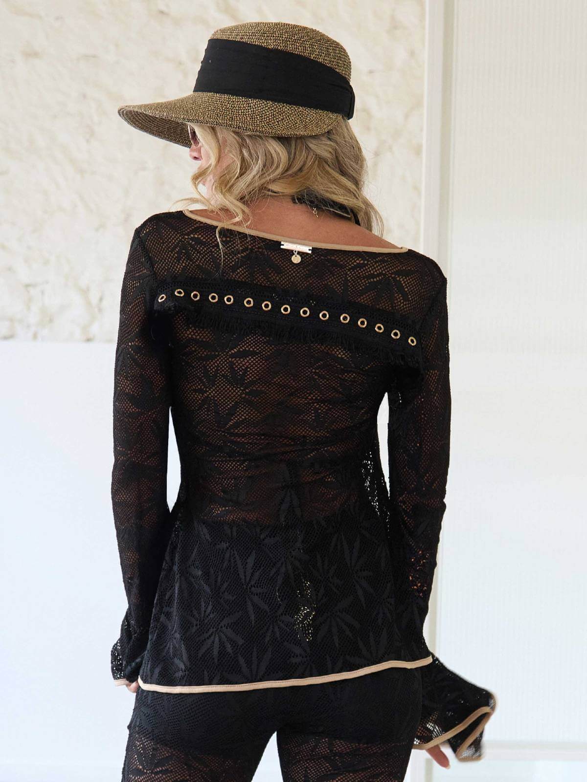 Top negro, de manga larga, de tejido crochet con estampado de flores en negro. En la parte de la espalda lleva detalle de arandelas en dorado sobre un detalle de tela de flecos. En el final de las mangas lleva volante con ribete en tono crudo. Se cierra en la parte del pecho con broche dorado en forma de conchas. La modelo mide 1.70 y lleva talla S.