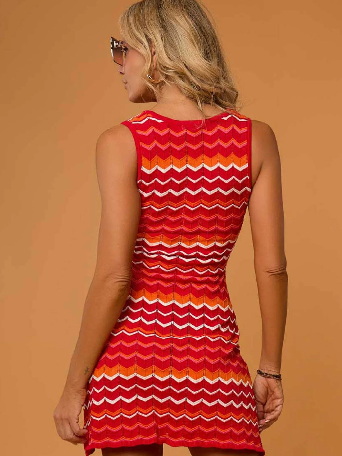 Vestido corto de punto entallado, en tonos rojos, naranjas y blancos. Lleva una pequeña abertura en el escote que se cierra con una cinta en el centro del pecho. En uno de los laterales del pecho lleva bordado el logo de la marca. Composición: 100% algodón.