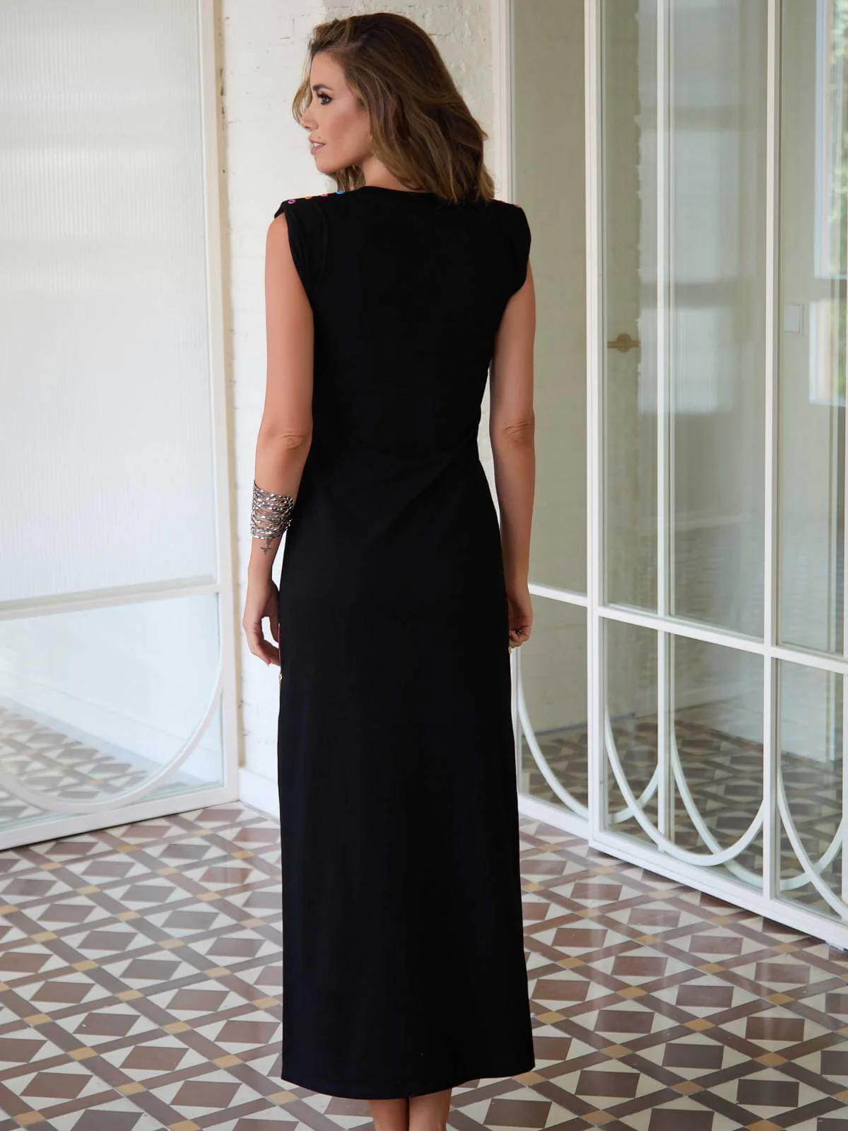 Vestido largo negro recto, desmangado con hombreras decoradas con tallas multicolores y escote redondo. En la parte central del pecho lleva bordado de la marca también multicolor y los laterales del vestido tienen cremalleras doradas en fondo rosa flúor para poder llevar el vestido más abierto o más cerrado del bajo.