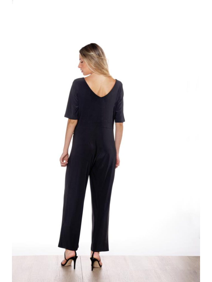 Mono largo en tejido fluido que aporta elegancia y movimiento en cada paso. Presenta escote en pico que estiliza la parte superior y manga amplia al codo que equilibra la silueta con un aire sofisticado. La cintura se define con lazada del mismo tejido, realzando la figura de forma favorecedora. Su pantalón de pierna ancha alarga visualmente y añade comodidad, convirtiéndolo en una opción versátil