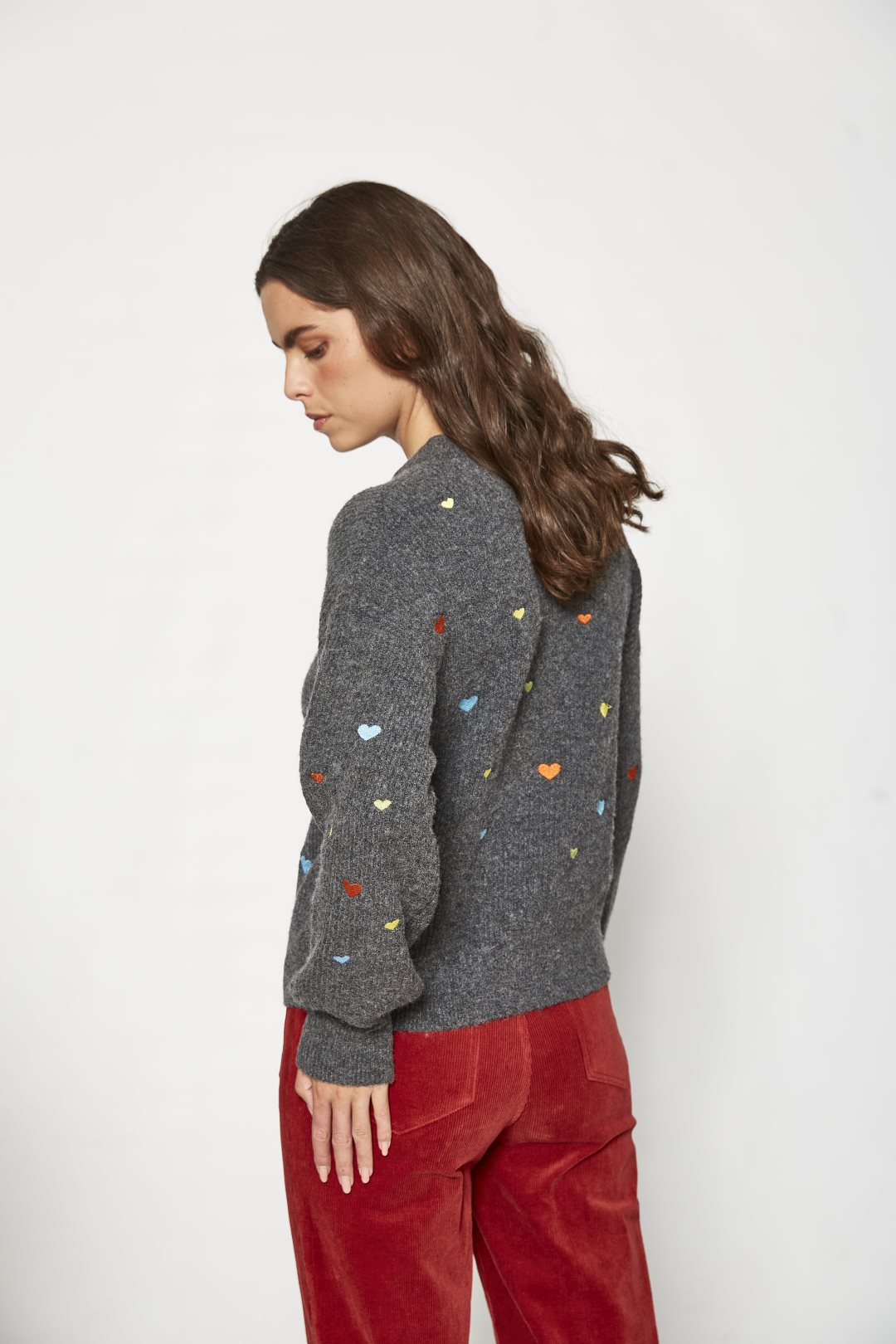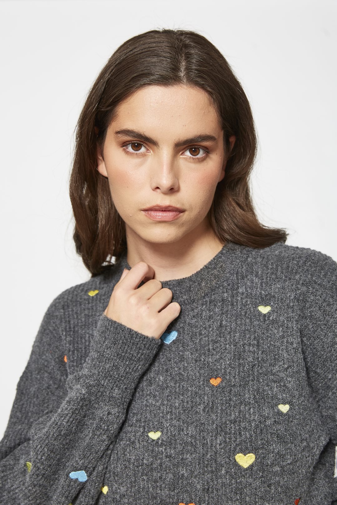 Jersey de punto con cuello redondo y diseño de pequeños corazones en relieve distribuidos por todo el cuerpo y las mangas. Manga larga abullonada con puños acanalados. Bajo acanalado y silueta de corte relajado. 70 % de poliéster reciclado. Color gris