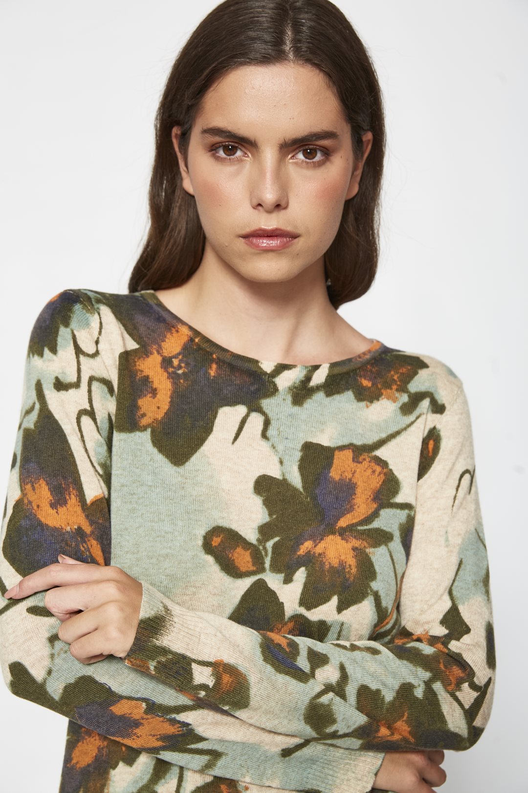 Jersey de punto de manga larga con cuello redondo y estampado integral de flores grandes con efecto difuminado. Mangas rectas con puños y bajo acanalados. Silueta de corte recto y ligeramente ajustado